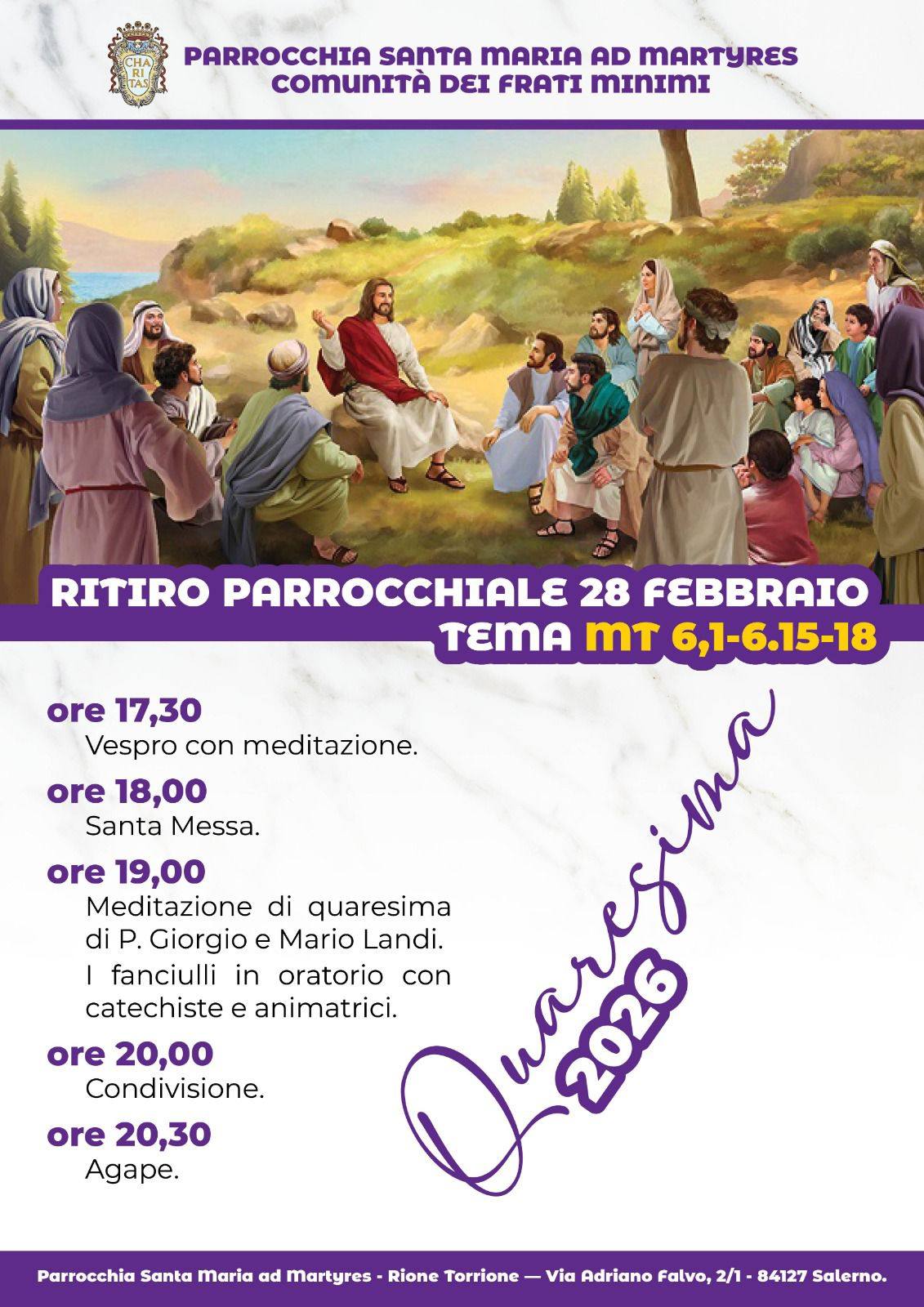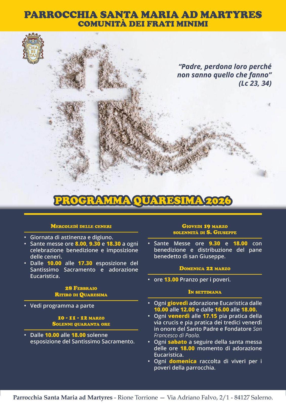 Sono a carico degli Studenti le sole spese relative all'acquisto dei testi per lo studio/approfondimento personale e le spese relative alla partecipazione al Simposio Minimo conclusivo. Per ogni corso sono disponibili 80 collegamenti. L'ISCRIZIONE va fatta dal 1 al 30 Settembre 2025 compilando l'apposita scheda e inviandola all'e-mail: scuoladispiritualitaminima@gmail.com anche da chi ha partecipato ai precedenti anni di formazione, perché l'inserimento negli elenchi del nuovo anno non è automatico. "Non perdiamo questa opportunità di partecipare online a questa scuola di spiritualità Minima dove impareremo ad amare San Francesco di Paola e la sua spiritualità", ha sottolineato il parroco p. Giorgio. |